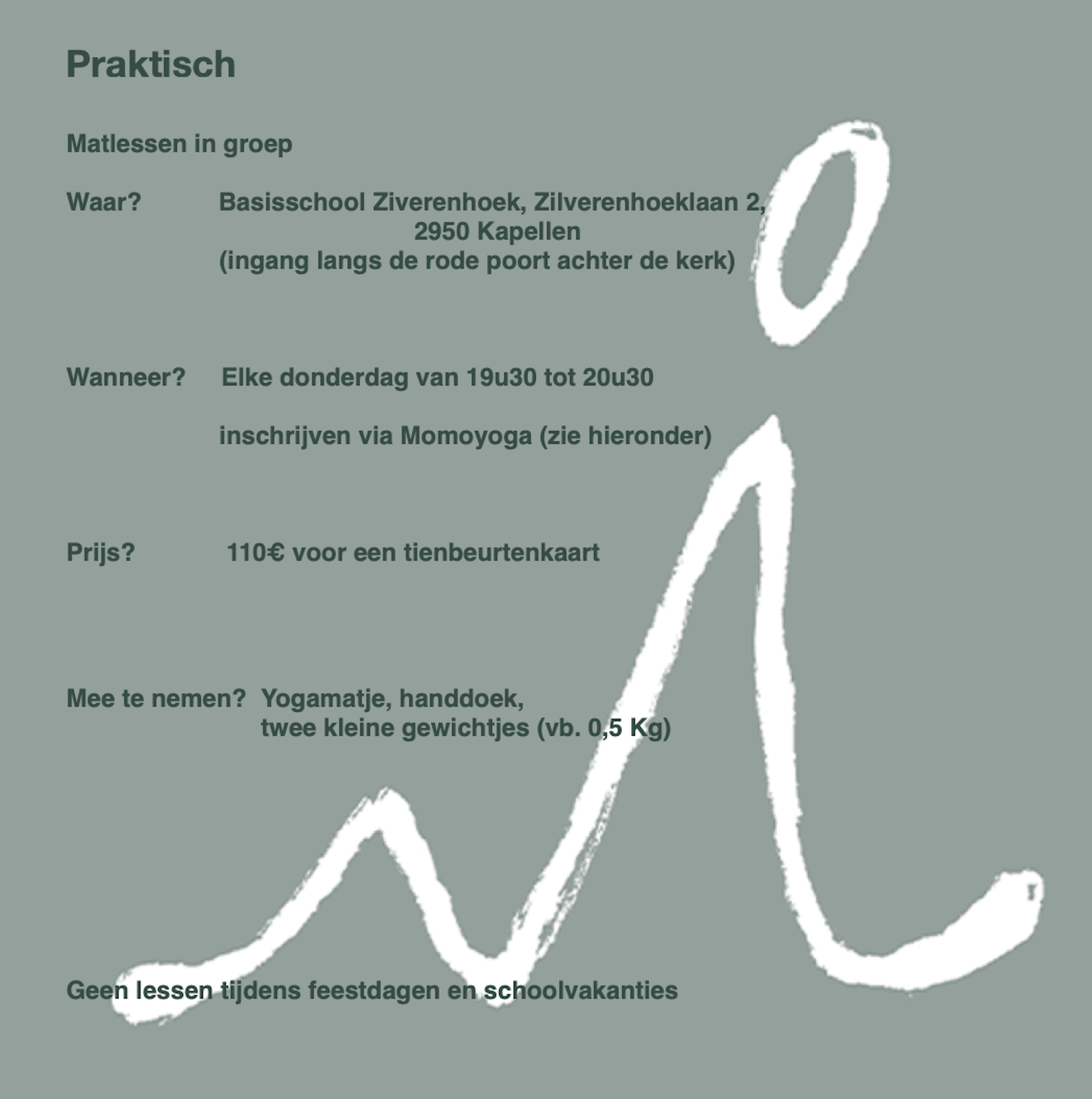 Pilates is een fysieke en mentale workout die spiergroepen tegelijk versterkt en rekt om een evenwichtiger en soepeler lichaam te krijgen. Het hele lichaam wordt betrokken bij Pilates. Vooral de romp “core” wordt getraind, een corset rondom je buik, rug en bekken. Bij het oefenen van Pilates krijg je sterkere kernspieren, meer stabiliteit, een beter houding en een algehele fysieke fitheid. Je wordt meer lichaamsbewust, je krijgt een beter evenwicht, coördinatie, kracht en lenigheid. Deze workout gaat niet zozeer om wat je doet maar veel meer om hoe je het doet. Na een tiental lessen begin je het resultaat te zien en te voelen. De groepslessen worden georganiseerd op verschillende locaties.